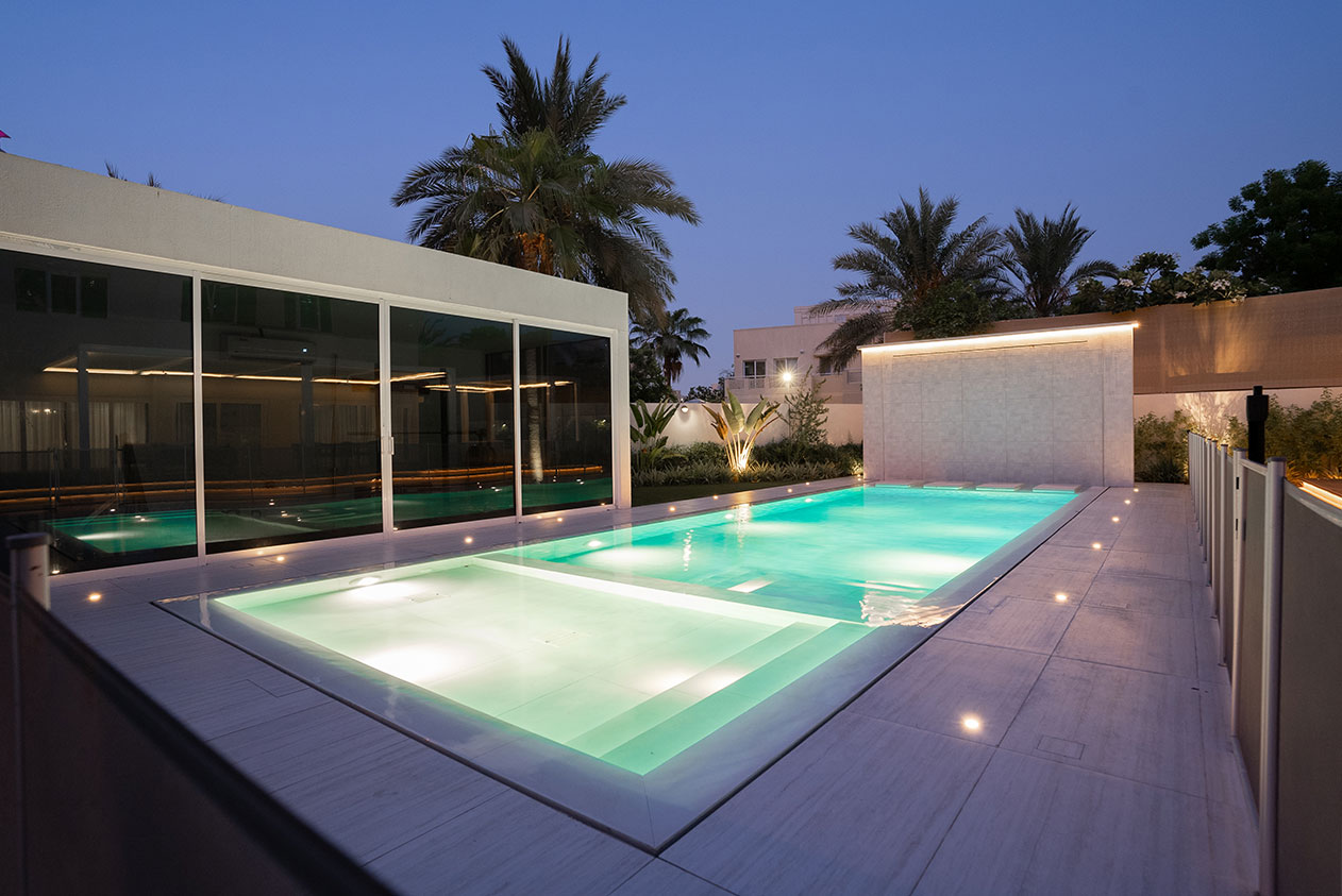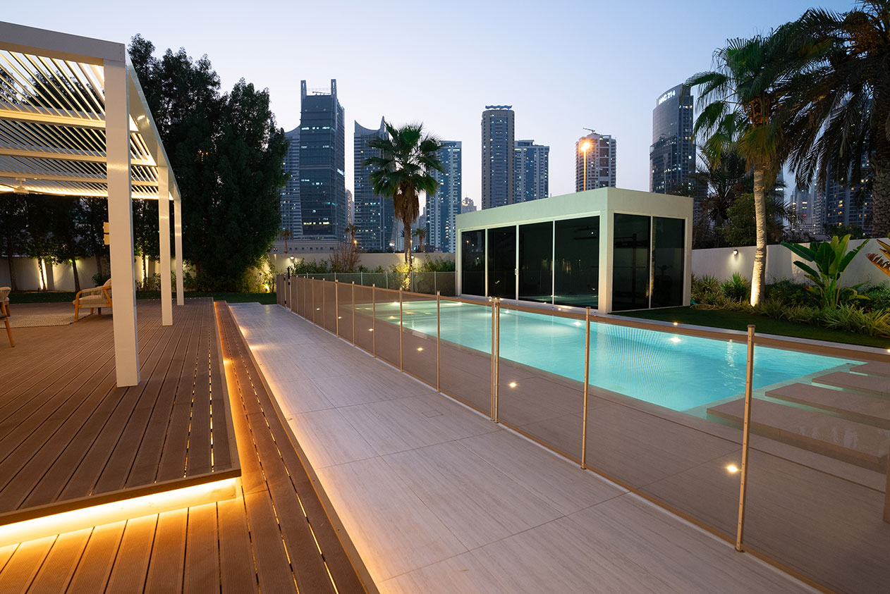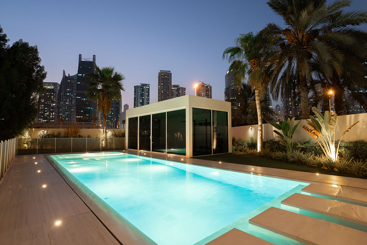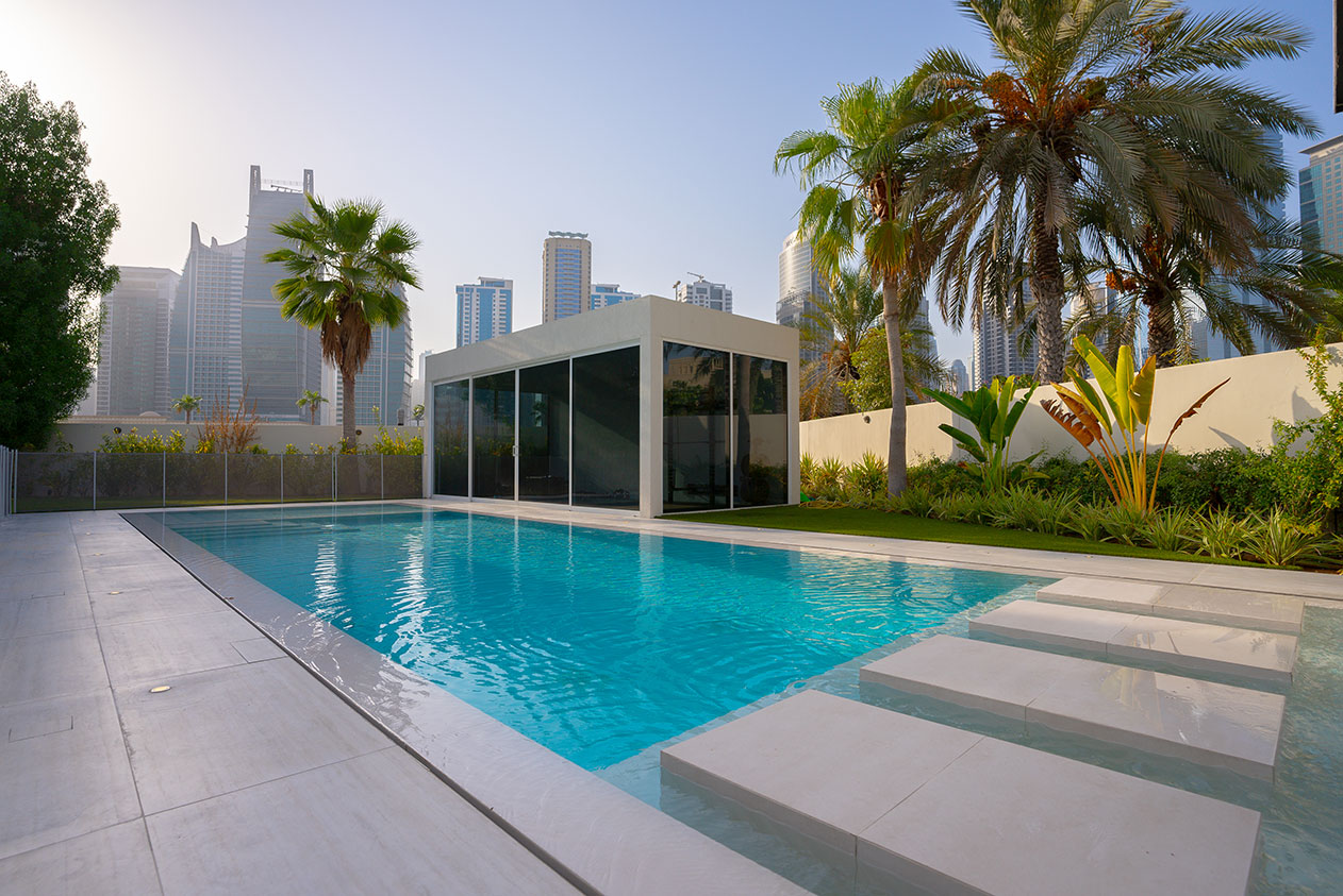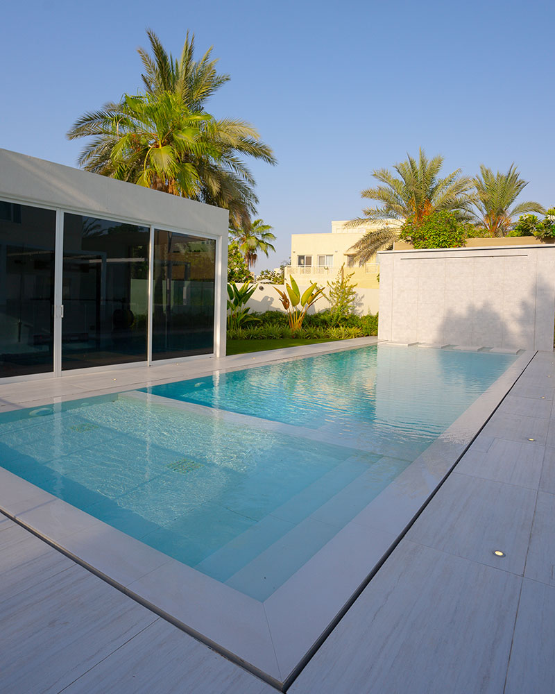 This contemporary landscape design in The Meadows, Dubai, blends luxury and functionality with a minimalist aesthetic. The focal point is a custom-built pool with crisp lines, surrounded by large-format porcelain tiles and a series of floating stepping stones that create a striking visual feature. Framed by tropical greenery and mature palm trees, the space offers a seamless indoor-outdoor connection to the adjacent glass pavilion. Designed for both relaxation and entertaining, this project delivers a private, resort-like escape in the heart of the city.