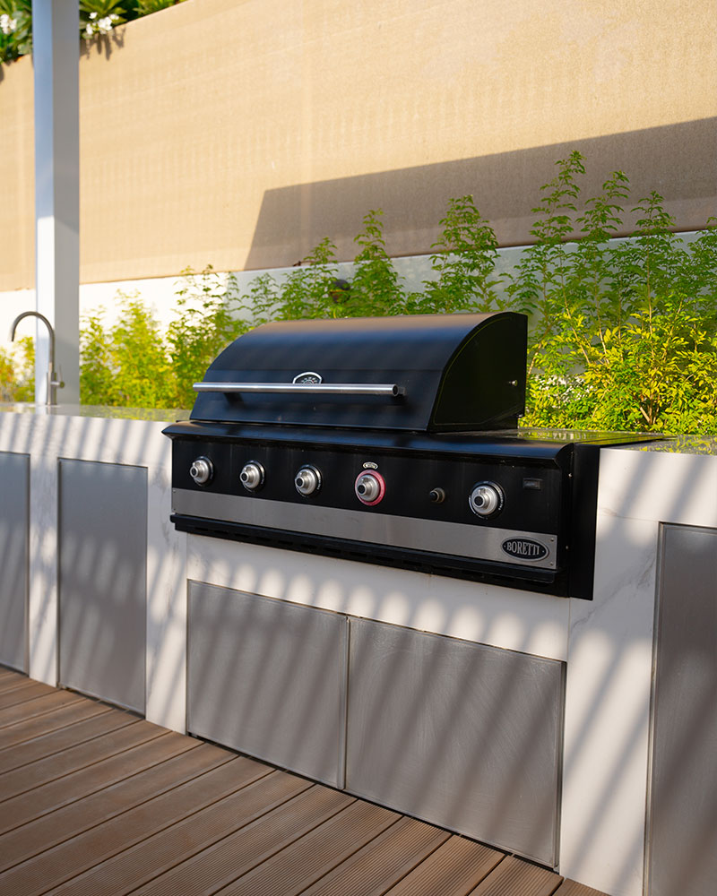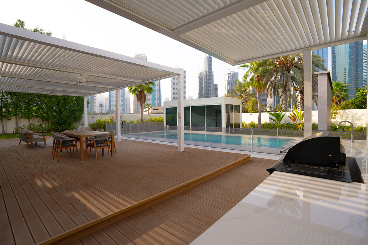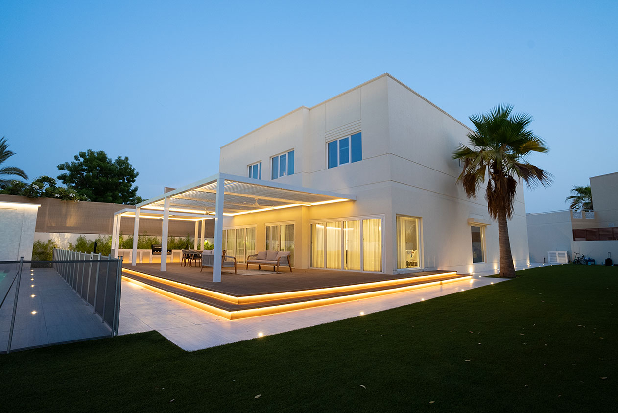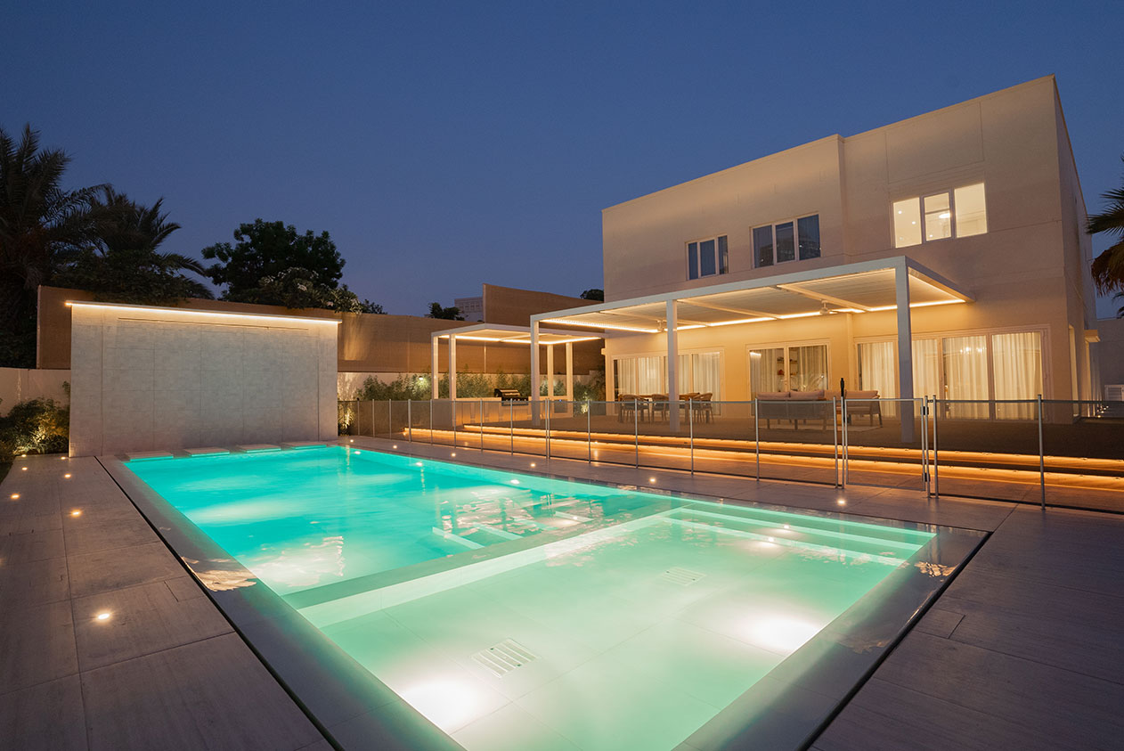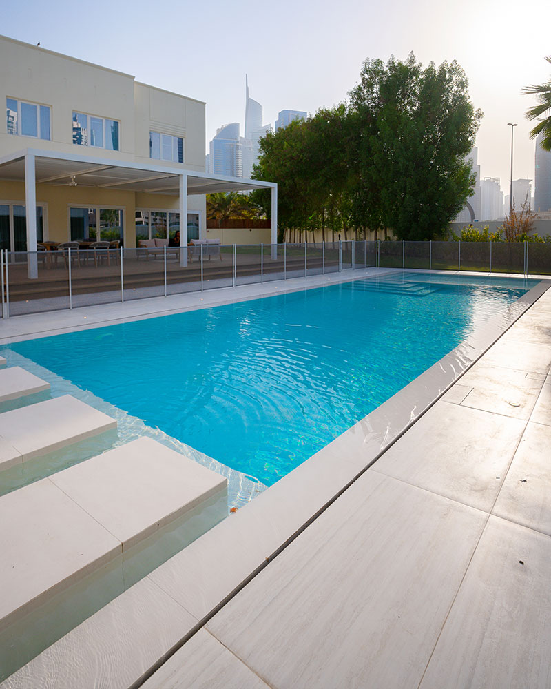 This contemporary landscape design in The Meadows, Dubai, blends luxury and functionality with a minimalist aesthetic. The focal point is a custom-built pool with crisp lines, surrounded by large-format porcelain tiles and a series of floating stepping stones that create a striking visual feature. Framed by tropical greenery and mature palm trees, the space offers a seamless indoor-outdoor connection to the adjacent glass pavilion. Designed for both relaxation and entertaining, this project delivers a private, resort-like escape in the heart of the city.