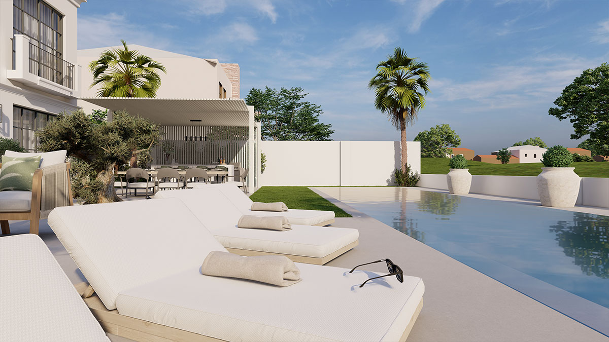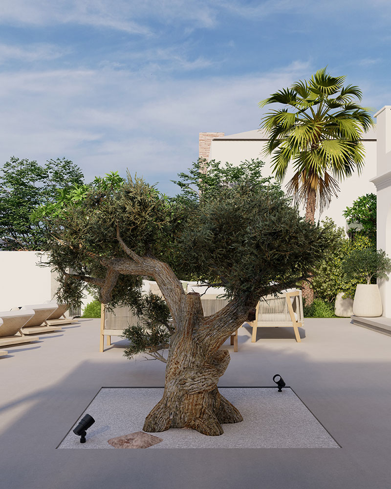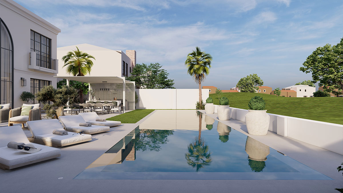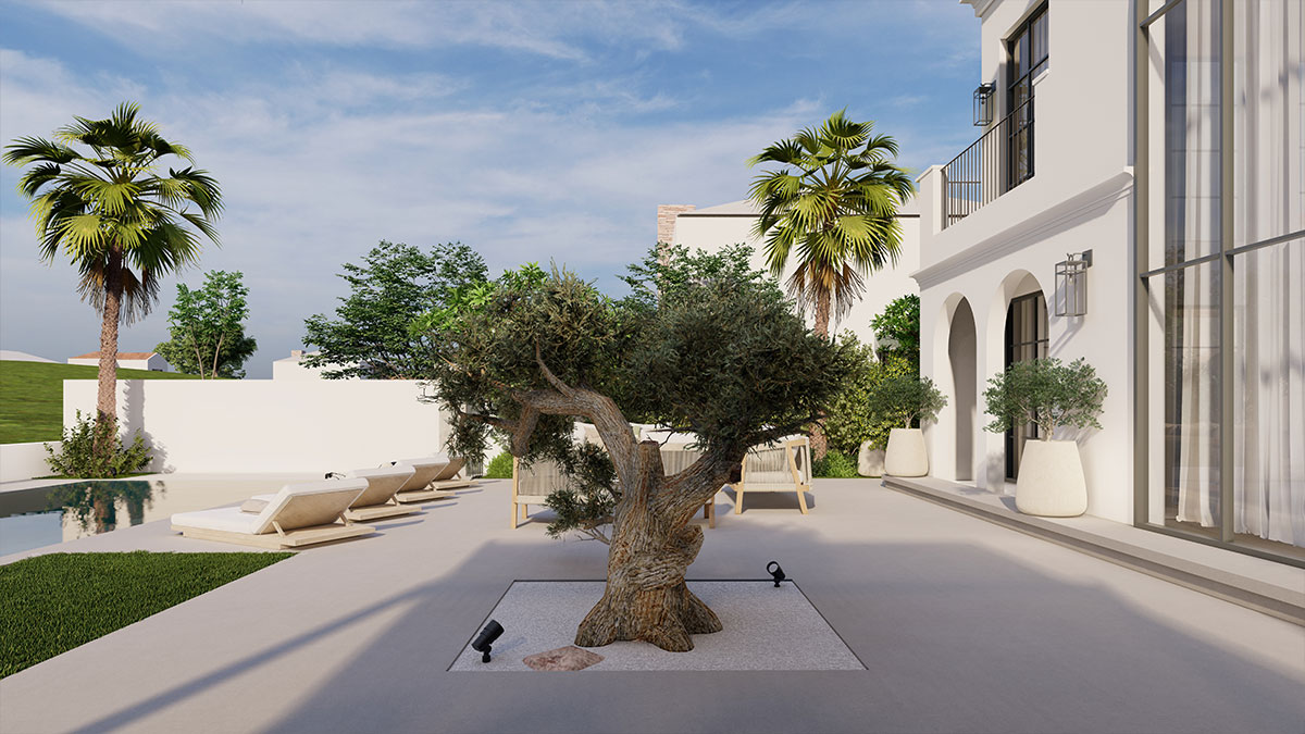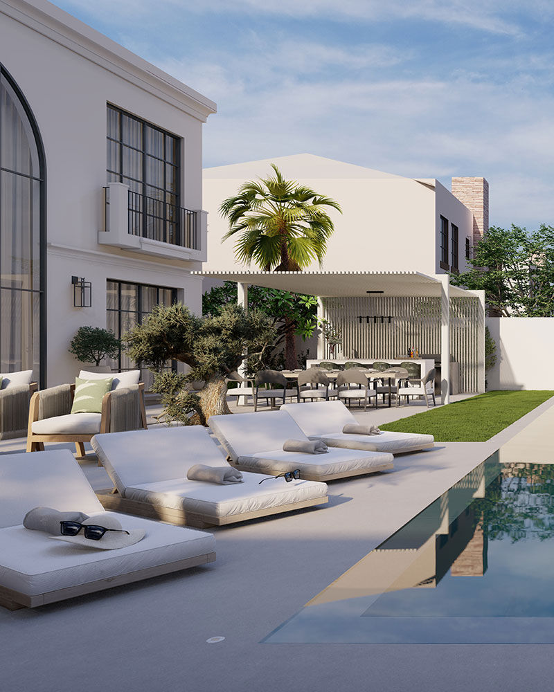 At the heart of the design is a spacious outdoor dining and BBQ area, perfect for hosting gatherings under the stars, complemented by a striking feature olive tree that adds Mediterranean elegance. The luxurious swimming pool, surrounded by natural stone decking and stylish sunbeds, provides a serene spot for relaxation. An outdoor shower adds convenience and privacy.