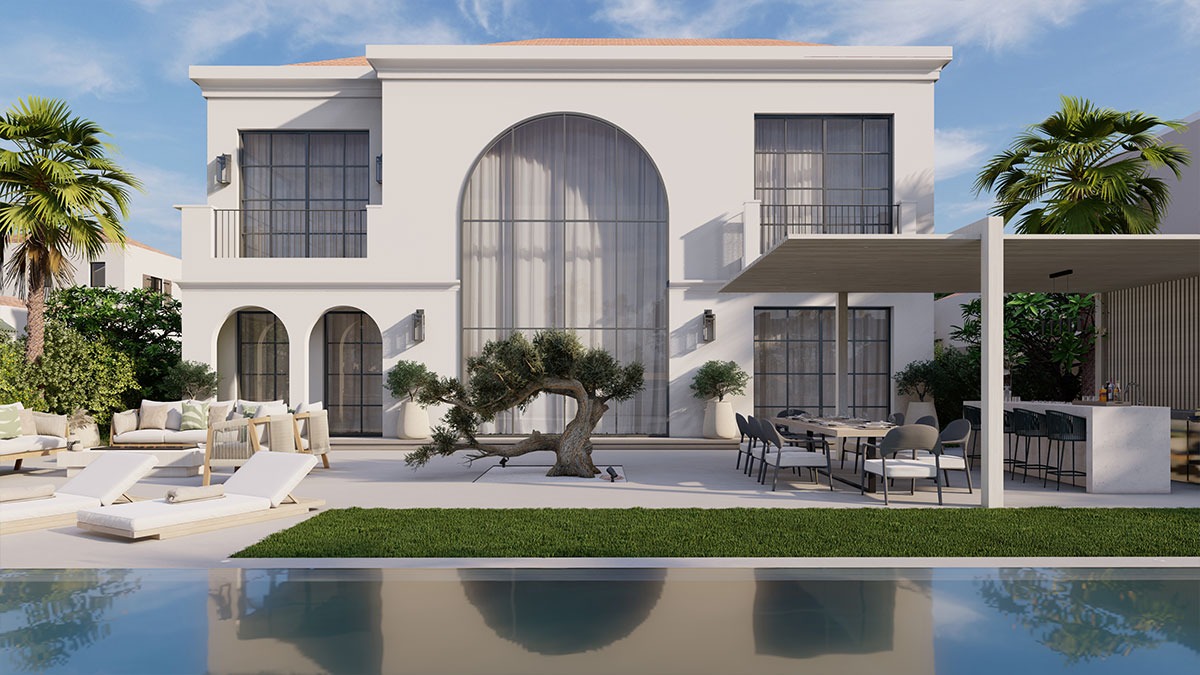 This Jumeirah Golf Estate landscape features a vibrant front garden, outdoor dining and BBQ area, and a luxurious pool. Lush greenery and elegant lighting create a serene, luxurious outdoor retreat.